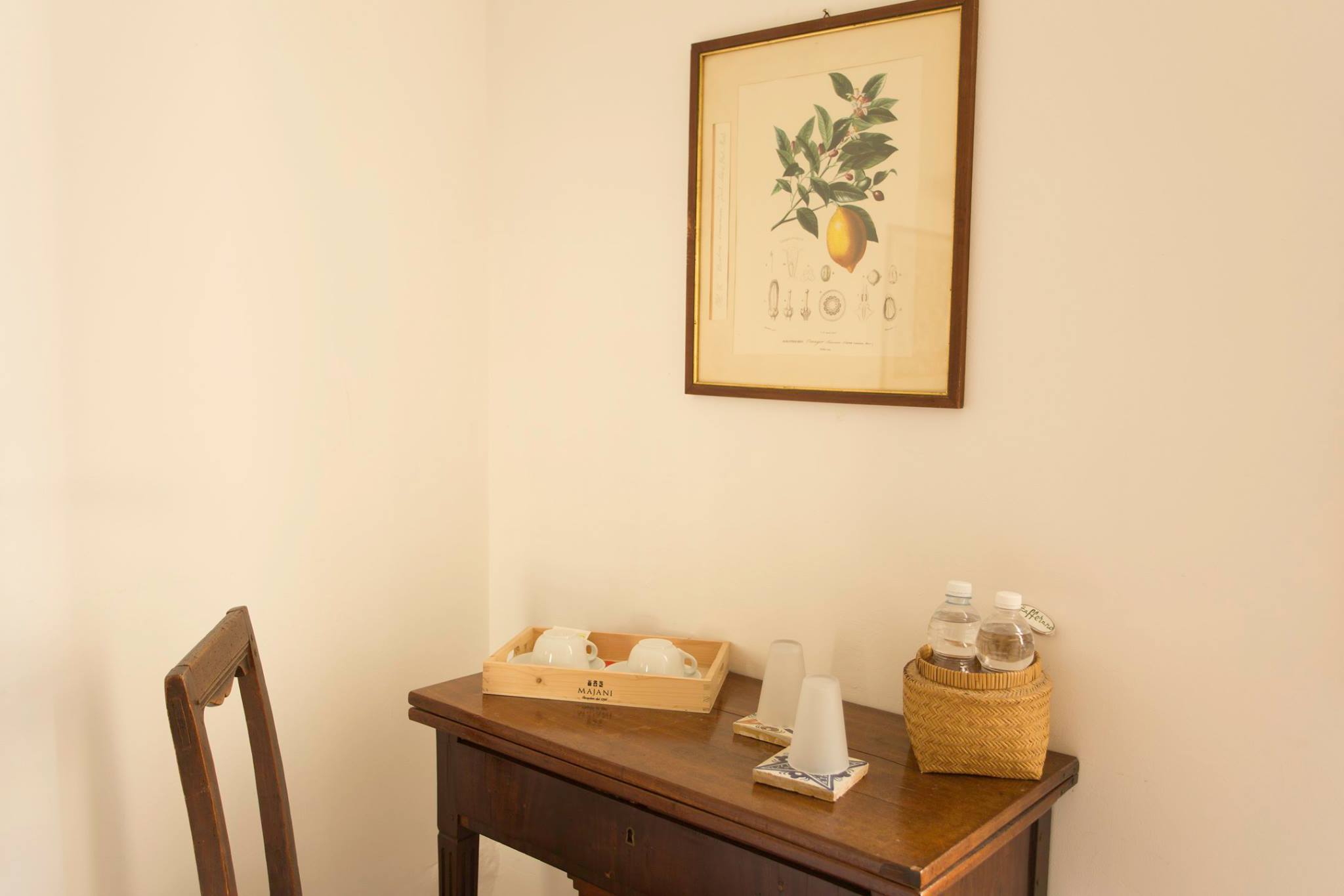 ai colori caldi giallo cedro, questa camera, gemella di Melograno, porta alla parete sopra lo scrittorio: la tavola botanica “Oranger Limonier” del Museo Nazionale di Storia Naturale di Parigi. Anche qui, sopra al letto: una stampa con i temi rinascimentali dello Zodiaco.