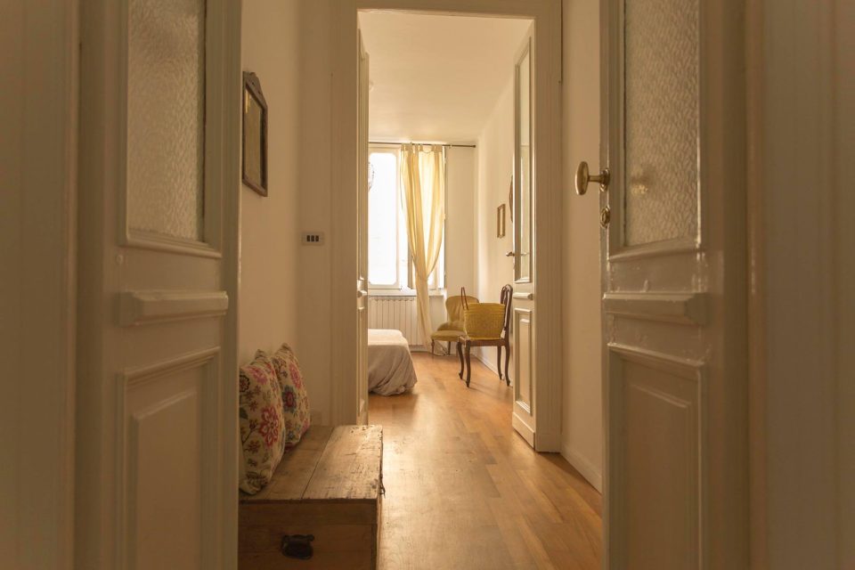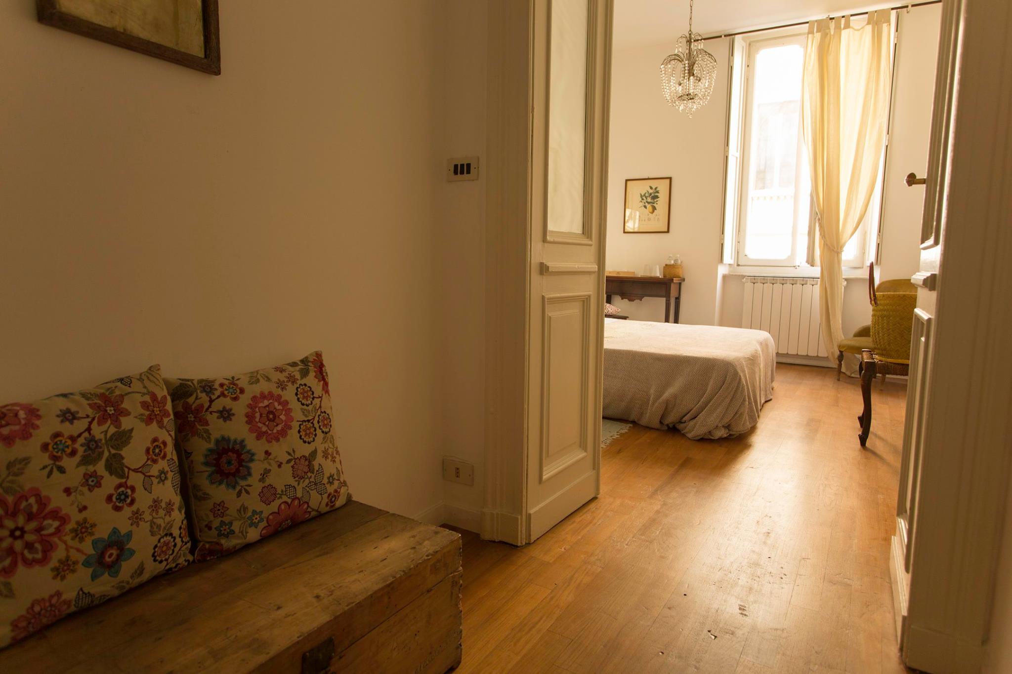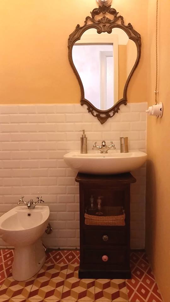 el bagno privato, da cui si accede dall’anti-bagno, il giallo dei muri incontra le cementine, nei toni e nei motivi degli antichi pavimenti pompeiani. L’entrata della camera è caratterizzata da un’antica cassapanca con due cuscini, dai temi floreali.